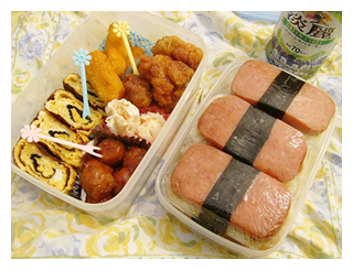 今日のお弁当はスパム結びと冷食フェア!(玉子焼き以外全部冷食です…) |
