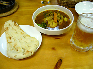 1時間!!待ってやっと出てきたのがこのカレーなのですが、カレー風味(!)のスープっていうくらいうす〜〜い。味がない・・・。
