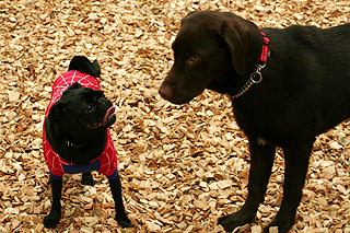 レトリバーに飛び掛るチョコ(」゜ロ゜)」 |