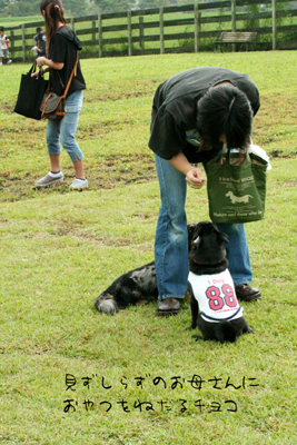 でも、チョコったらたくさんいるワンたちと全然遊ばずに、見知らぬお母さんにお座りアピールでおやつをもらってます(;-_-;)