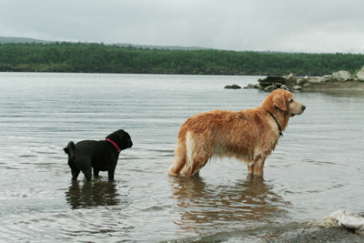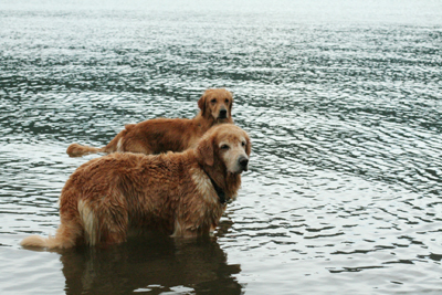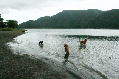 CAFE M のすぐ前にある西湖ではゴールデンレトリバーの仔が楽しそうに水遊びしていました。