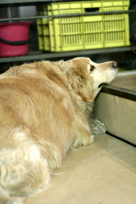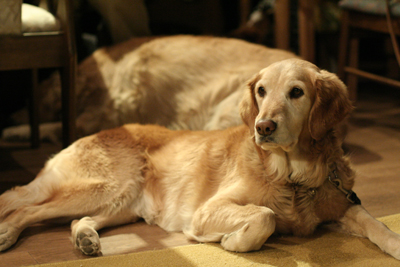 暖房の効いた部屋で、こんな格好で寝ているゴールデンのコ。