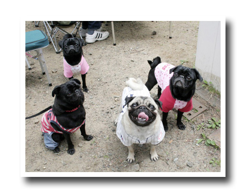 ママさんとお揃いのお洋服を着たパグちゃんたち。