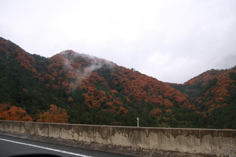 お天気いまいちですが、道もすごく空いてるし、両側の紅葉した山々を眺めながら走れるので気持ち良い〜! |