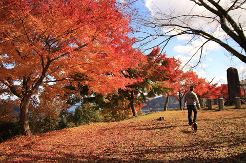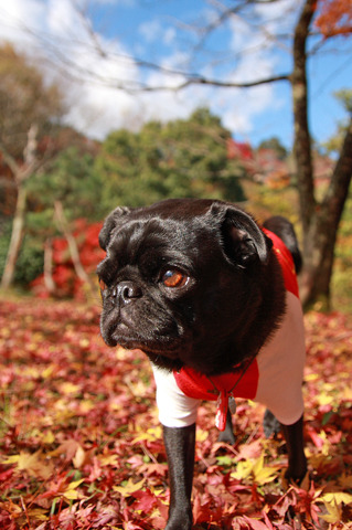 紅葉のじゅうたんを歩くチョコ。 |