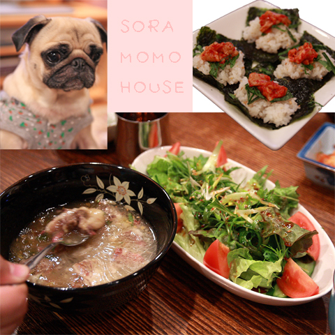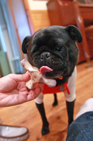 食事の間パグズには煮込んだテールスープの骨を♪