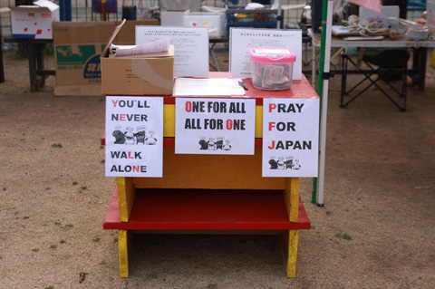 会場には募金箱とペット同伴避難のための署名ブースも。 |