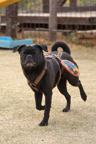 ハーネスをつけたパグちゃんを両端の飼い主さんが呼んで、引っ張りあっこしますよ。 |