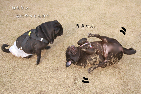 ごろんごろんと芝をくっつけるスイカちゃんと、そんな姉を不思議そうに見るアップルちゃん^m^ |