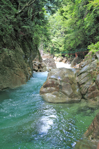 エメラルドブルーの吸い込まれるような美しい渓谷を眺めながら遊歩道は続きます。 |