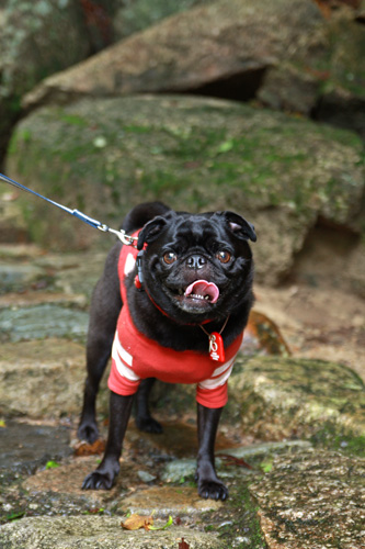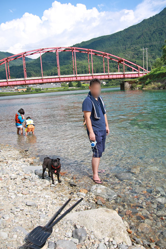 チョコは安全のために流れていかないようにひも付き&浅瀬&大きな岩の手前で遊びました。 |