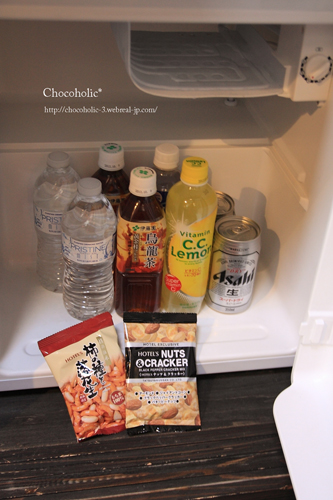 お部屋の冷蔵庫にはサービスのドリンク&おつまみが。
