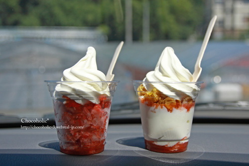 チョコちゃんがいるから、テイクアウトで。 シャリシャリイチゴのソフトクリームとイチゴソースとヨーグルトのソフトクリーム。 |