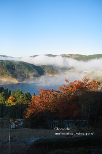 部屋から見える阿木川湖の朝もや。